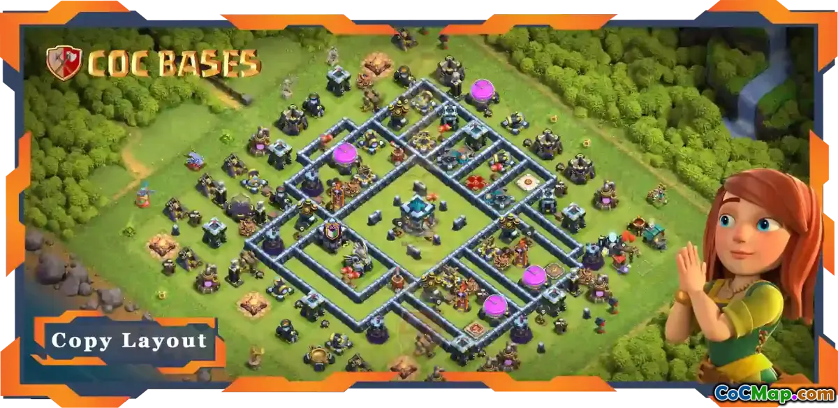 The layout strategically positions the Town Hall at the center of the base, surrounded by a variety of defensive structures and traps that work together to protect it. This central placement makes it more challenging for attackers to reach the Town Hall directly. The incorporation of defensive elements such as seeking air mines and air bombs enhances the base's capability to counter air attacks, which are often used to overwhelm defenses in TH13 bases.