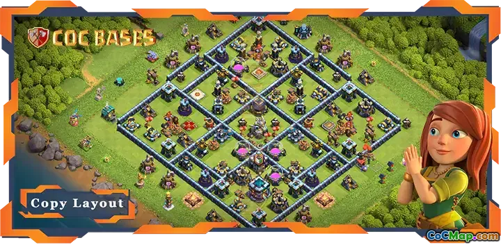 In summary, the top TH13 base layout featuring a hybrid, anti-air design maximizes defensive potential by combining smart structural choices with powerful defensive capabilities. With the Town Hall positioned strategically and defensive units distributed across the four sections, this layout offers strong protection against a variety of attack types, particularly those focused on ground troops and aerial units. Players aiming to maintain their trophies and resources will find that implementing this layout can yield significant benefits in the competitive environment of Clash of Clans.