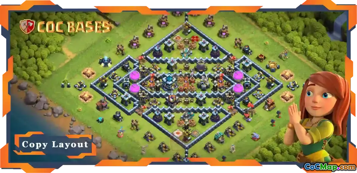 Overall, this top farming base layout for TH13 effectively combines resource protection with strong defensive structures and traps. By employing this hybrid anti-everything design, players can enhance their resource gathering and defend against diverse attack formats, making it an optimal choice for Clash of Clans enthusiasts.