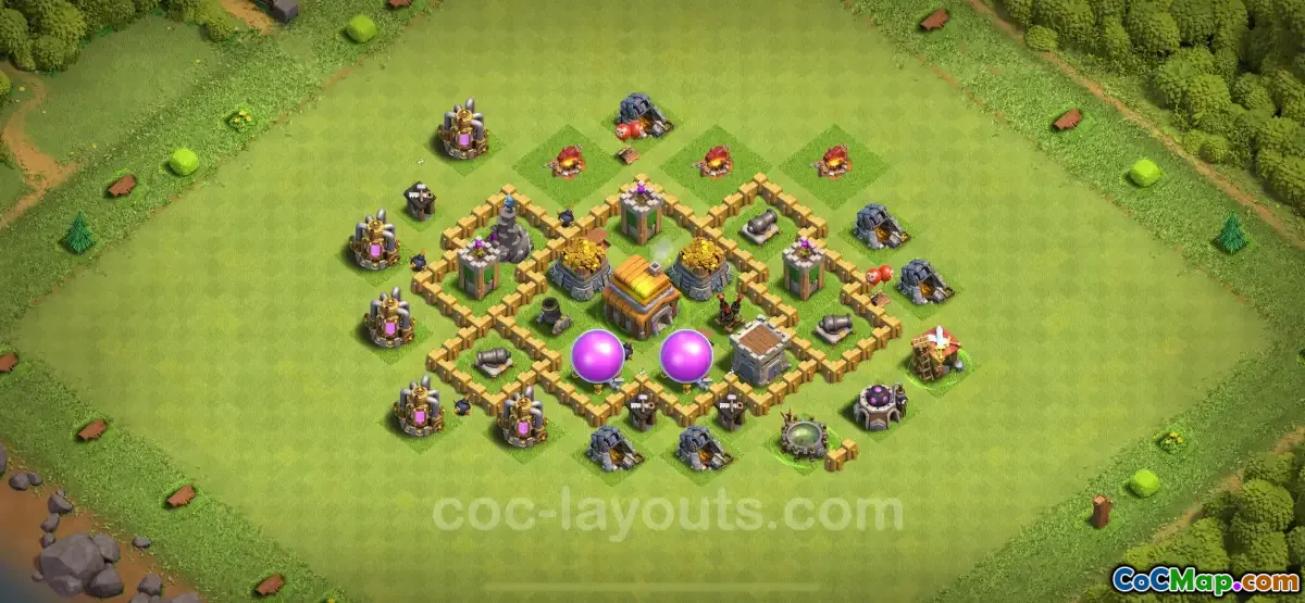 Den typiske TH5-basedesignen inkluderer strategisk plassering av forsvar, som kanoner og bueskyttertårn, som bidrar til å skape et formidabelt forsvar mot angrep. I dette oppsettet er det avgjørende å plassere disse forsvarene i en konfigurasjon som lar dem dekke hverandre, og dermed forbedre den generelle beskyttelsesdekningen. Dette sikrer at selv om en defensiv struktur er skadet, kan andre fortsatt gi støtte og beskyttelse. I tillegg er oppsettet designet for å tvinge angripere til å nærme seg fra mindre fordelaktige vinkler.