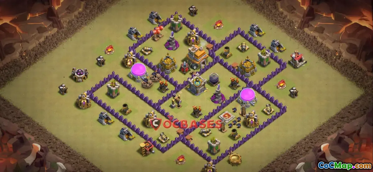 Key features of this Town Hall 7 war base include an anti-ground setup, which means it is built to counter ground troop attacks effectively. Various defensive structures such as cannons, archer towers, and traps are placed in a manner that inhibits the movement of ground units. This layout not only protects the Town Hall itself but also covers critical resources, ensuring that they are safeguarded from enemy raids. The configuration also aims to spread out defenses to prevent attackers from easily deploying strategies that might otherwise take down multiple buildings at once.