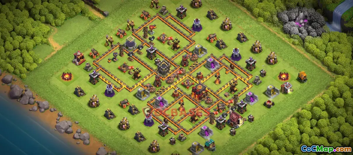 The Town Hall 10 war base in Clash of Clans is a strategic layout designed to protect your resources and defend against enemy attacks during clan wars. This base typically features well-placed walls, defensive structures such as cannons, archer towers, and air defenses, along with strategic placement of traps to surprise attacking troops. The main goal is to create a balanced defense that can withstand various attack strategies commonly used at this level.