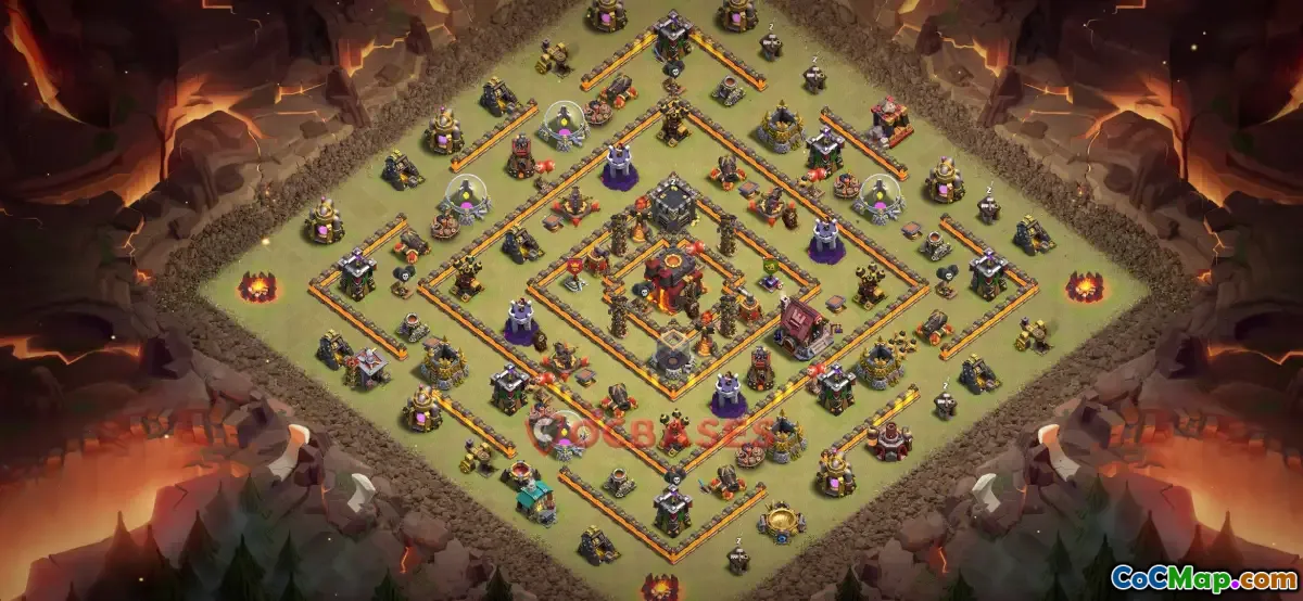 The Town Hall 10 war base in Clash of Clans is a strategic layout designed to safeguard the player's resources and defenses during clan wars. It typically features well-placed walls, defensive structures such as cannons, archer towers, and splash damage units like mortars, arranged to create strong choke points and prevent attackers from easily reaching the core. A good Tenth Town Hall war base also incorporates trap placements like bombs, giant bombs, and air bombs to surprise and weaken enemy troops, making it more difficult for opponents to achieve a high percentage of destruction.