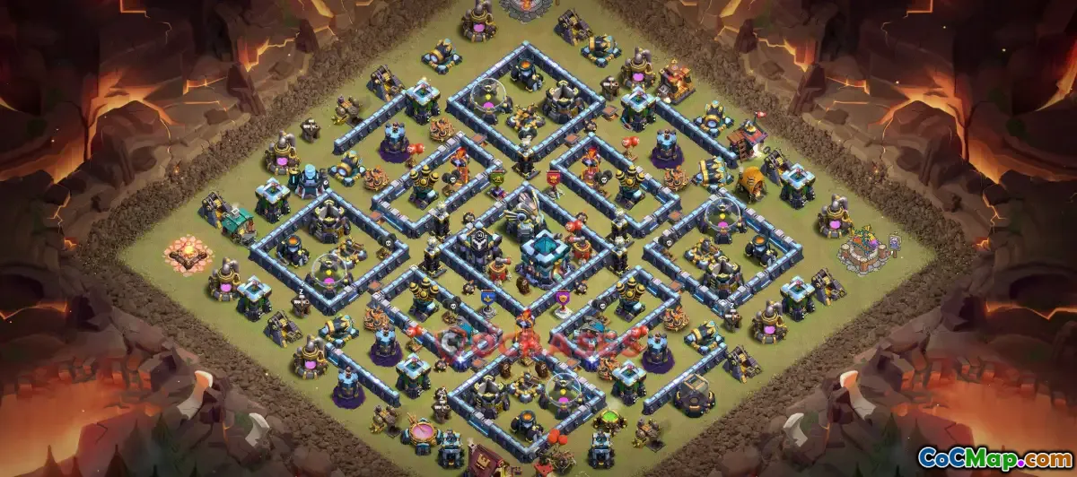 This Town Hall 13 trophy base is expertly designed as an anti-3-star layout, focusing on layered defenses to protect your core. The Town Hall, hosting the Giga Inferno, is centrally placed and shielded by thick walls, making it challenging for attackers to reach directly. Key defenses such as Inferno Towers, Eagle Artillery, Scattershots, and X-Bows are arranged to provide mutual coverage, ensuring no blind spots and maximizing damage output against both air and ground units.