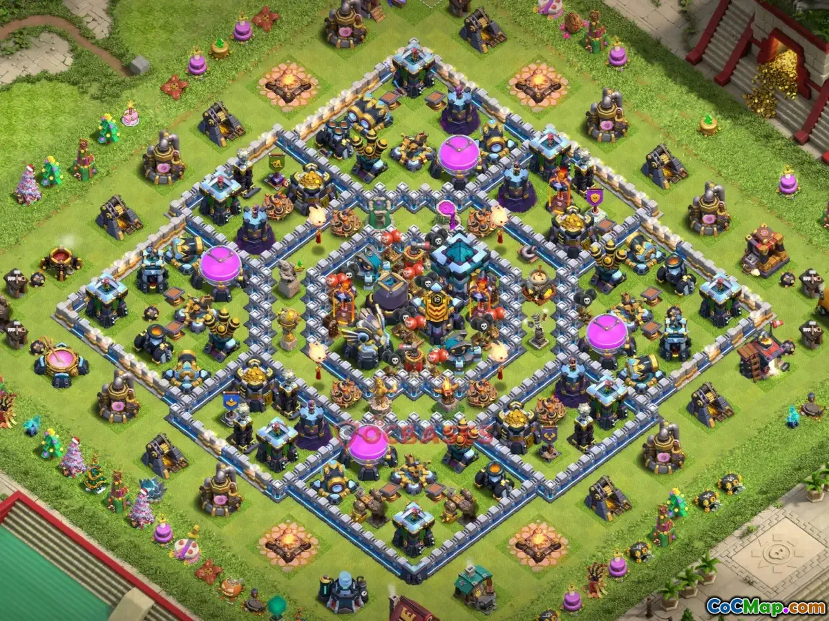 This Town Hall 13 trophy base is meticulously designed to protect your trophies while offering strategic distractions around the core. Its sectional layout ensures that attacking troops are diverted away from key defenses and resources, making it harder for opponents to achieve high destruction percentages. The placement of defenses and traps creates confusing pathways, encouraging attackers to spend more time and resources, which ultimately helps preserve your trophies.
