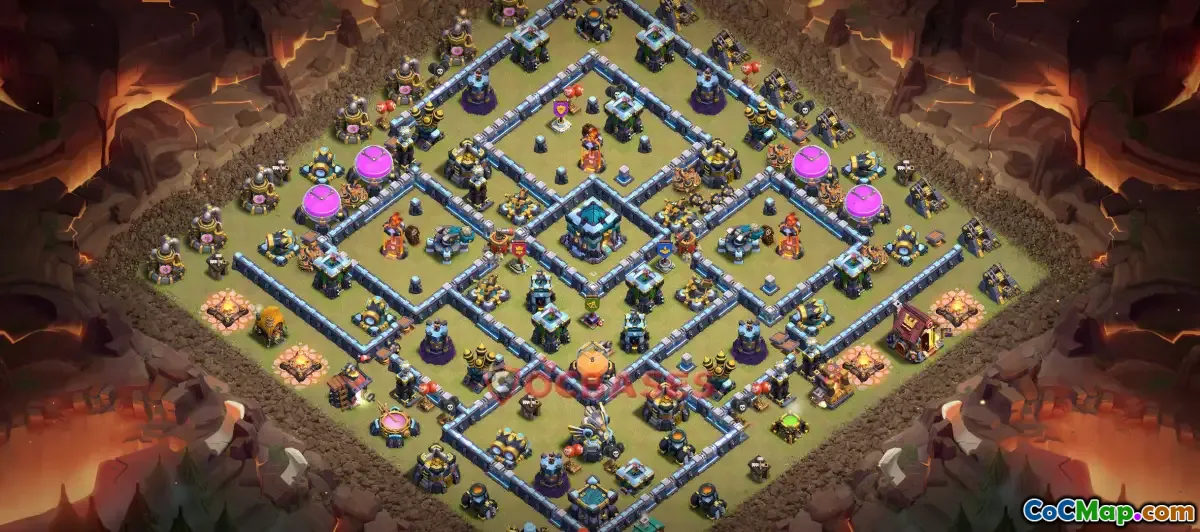 This Town Hall 13 war base design in Clash of Clans is built with a square layered layout specifically aimed at preventing opponents from achieving a 3-star victory. The Town Hall is centrally located, surrounded by multiple concentric walls that create a strong barrier. This placement helps to ensure that attacking forces have to break through several defenses to reach the core, making it more difficult to secure a full destruction.