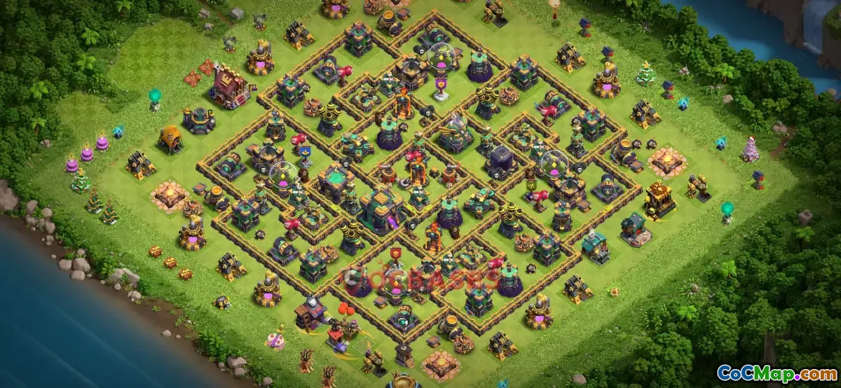 The Town Hall 14 farming base in Clash of Clans is designed primarily to protect resources and prevent attackers from easily stealing gold, elixir, and dark elixir. This type of base setup typically incorporates strategic placement of storages within the core or protected compartments, making it difficult for enemies to reach these valuable assets. Effective farming bases are essential for players focused on resource collection and upgrading their buildings, ensuring they can gather enough materials while minimizing losses during attacks.