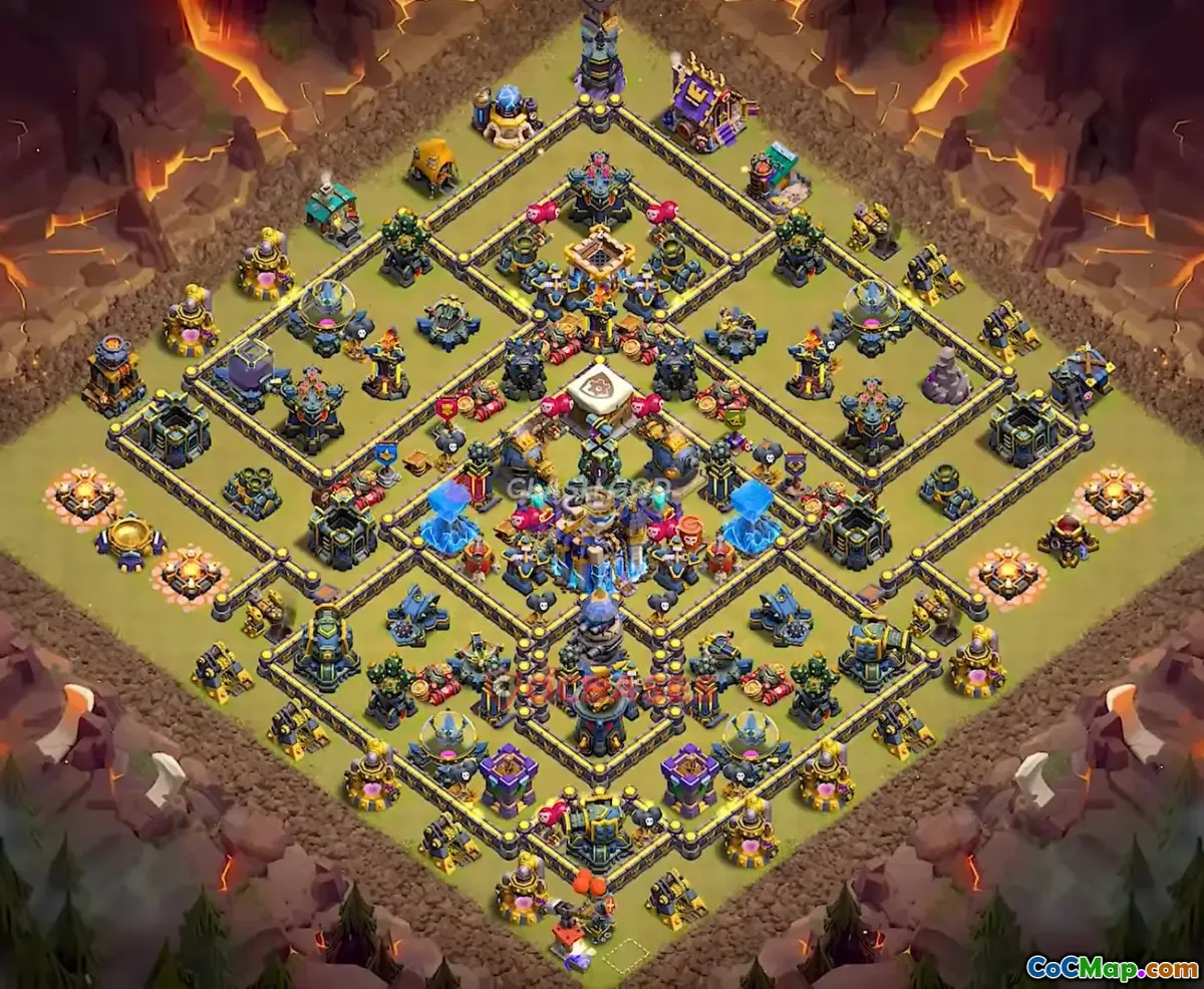 This Town Hall 18 war base design is optimized to protect your clan’s resources and trophies while providing strong defense against enemy attacks. It features well-placed traps, strategic positioning of Clan Castle, and key defenses to create a resilient layout suitable for war scenarios.