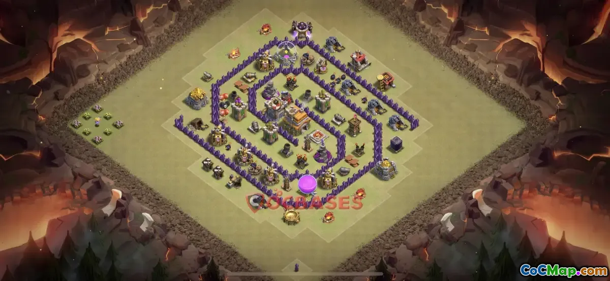 The Town Hall 7 war base in Clash of Clans is designed with a strategic layout known as the Typhoon base. This design aims to provide a robust defense during clan wars, making it difficult for opponents to penetrate deeply into the base. The unique structure encourages attackers to approach from the edges, where they encounter a series of defenses that are positioned to inflict damage while remaining out of reach for most attacking units.