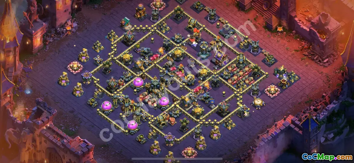 This top-tier Town Hall 17 war base layout is specifically crafted to thwart 3-star attacks during Clan War Leagues in 2025. It includes strategically placed walls, traps, and defenses to maximize protection against professions like heroes, Golem, and air units. The design focuses on evenly distributing defensive structures to create multiple layers of protection around key assets, making it difficult for attackers to achieve full stars.