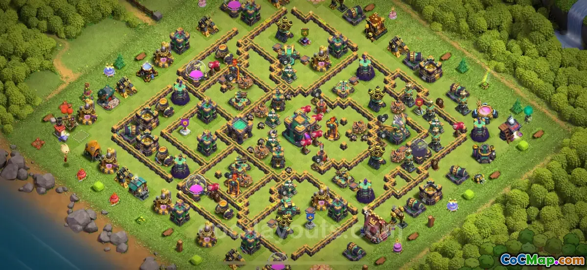 This description discusses a top-tier base layout for Town Hall 14 (TH14) in Clash of Clans, designed specifically to counter attacks involving P.E.K.K.A.s and Golems. The base is considered one of the best options for defending against these units, making it highly valuable for players looking to protect their resources and trophies. The layout's primary focus is on disrupting strategies that rely heavily on these powerful ground troops, ensuring a more secure defense for players on the TH14 level in 2025.