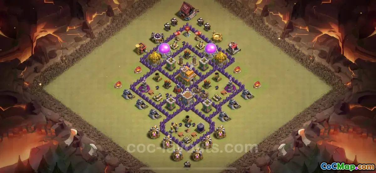 Jednym z głównych aspektów udanej bazy bojowej TH7 jest jej układ. Gracze powinni wybierać projekty, które sprytnie rozmieszczają ratusz i magazyny, aby zminimalizować ryzyko łatwego dotarcia do nich atakujących. Baza hybrydowa równoważy potrzebę ochrony ratusza i magazynów zasobów, utrudniając wrogom osiągnięcie szybkiego trzygwiazdkowego zwycięstwa. Układy obejmujące strategicznie struktury obronne i mury mogą odstraszyć atakujących i zmusić ich do obrania trudnych ścieżek.