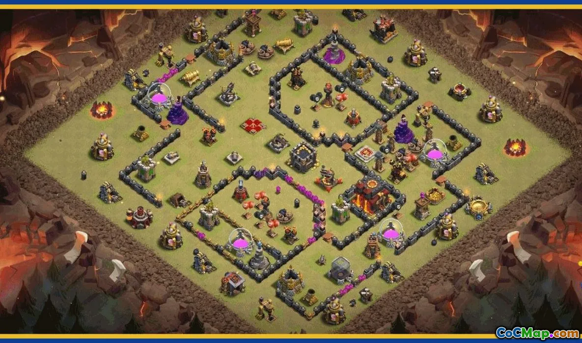 The base layout for Clash of Clans Town Hall 10 offers players a variety of strategic options to protect their resources and defenses. This particular layout includes a well-placed Town Hall, surrounded by defensive structures such as cannons, archer towers, and wizard towers designed to fend off enemy attacks. Proper placement of walls and defenses helps create a strong barrier that slows down attackers and minimizes damage to vital buildings.