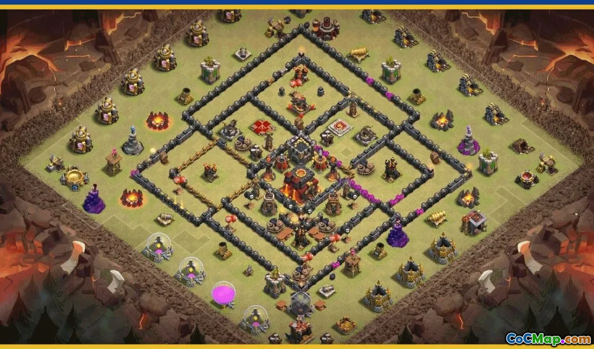 For players focusing on their home village, the layout emphasizes the placement of traps, bombs, and walls to slow down enemy troops and create bottlenecks, making it more difficult for attackers to penetrate defenses quickly. The design also maximizes the use of the available space around the Town Hall, ensuring that defensive structures cover critical points and that key buildings are protected within the inner sections of the base. This strategic placement helps defend against common attacking strategies used by opponents at the Town Hall 10 level.