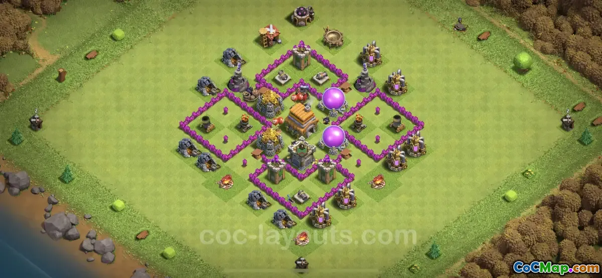 Strategia skutecznej bazy Ratusza na poziomie 6 obejmuje staranne rozmieszczenie struktur obronnych i przechowywanie zasobów. Umieszczenie magazynów wewnątrz ścian zapewnia ich dobrą ochronę przed atakującymi. W tym układzie najcenniejsze zasoby znajdują się w centrum bazy, otoczone budynkami obronnymi, takimi jak działa, wieże łucznicze i pułapki. Utrudnia to wrogom dotarcie do Twoich magazynów bez uprzedniego pokonania znaczących umocnień.