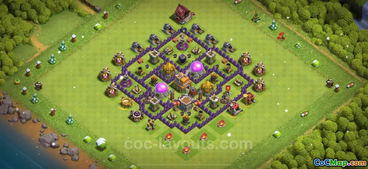 Układ bazy TH7 zazwyczaj obejmuje dobrze rozmieszczone struktury obronne, szczególnie te, które mogą celować w różne rodzaje ataków. Włączenie mechanizmów obronnych, takich jak działa, wieże łucznicze i moździerze, do strategicznego projektu pomaga stworzyć konfigurację przeciw wszystkiemu, co oznacza, że mogą bronić się przed różnymi atakującymi jednostkami. Ta równowaga jest szczególnie ważna dla zarządzania zasobami, umożliwiając graczom ochronę ich cennych zasobów, takich jak złoto i eliksir, przed kradzieżą podczas najazdów wroga.