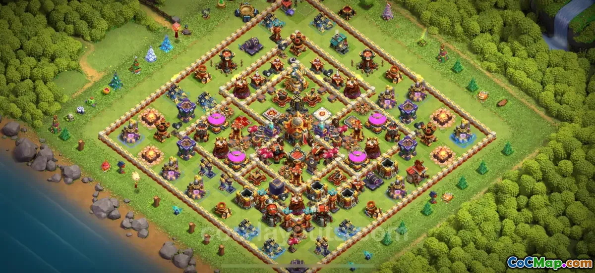 The TH16 configuration includes strategic placements of buildings, traps, and defenses to create a layout that deters enemy attacks. By clustering important defensive structures and resources, the base can effectively use its layout to minimize vulnerability. This base design not only serves to protect resources but also makes it difficult for opponents to earn maximum stars in battles, ensuring that most attacks result in lower scores for the attackers.