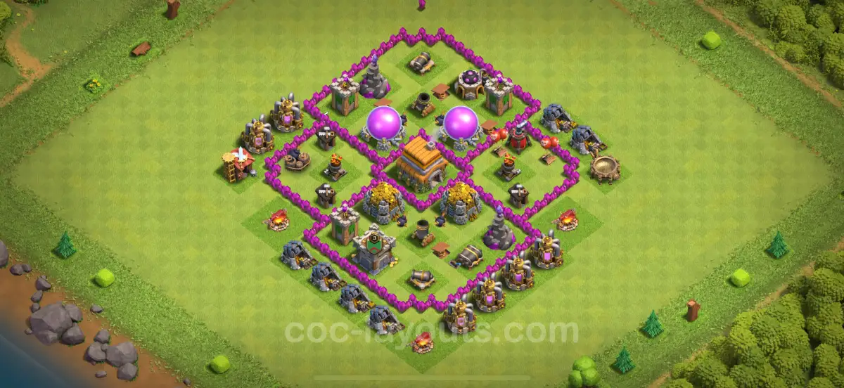 Głównym celem bazy TH6 jest zwykle ochrona kluczowych konstrukcji, takich jak ratusz i magazyny. Typowa strategia dla tego poziomu polega na umieszczeniu Ratusza centralnie, co utrudnia atakującym dotarcie do niego. Dodatkowo otoczenie go budynkami obronnymi – takimi jak armaty, wieże łucznicze i obrona przed obrażeniami obszarowymi – zapewnia solidny front przeciwko nadchodzącym oddziałom wroga, utrudniając atakującym osiągnięcie pełnego zniszczenia.