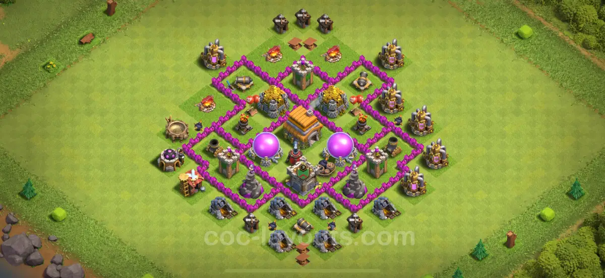 Ochrona zasobów ma kluczowe znaczenie dla podstawowego projektu ratusza na poziomie 6. Odpowiednio rozmieszczając magazyny – szczególnie te wypełnione cennymi zasobami – gracze mogą zminimalizować potencjalne zyski dla najeźdźców. Układ pozwala na ochronę magazynów w rdzeniu bazy, utrudniając dostęp do nich bez uprzedniego zajęcia się obroną. To oddzielenie zachęca graczy do priorytetowego traktowania ataku na ratusz, poświęcając w ten sposób szansę na splądrowanie magazynów, co jeszcze bardziej zwiększa bezpieczeństwo zasobów.