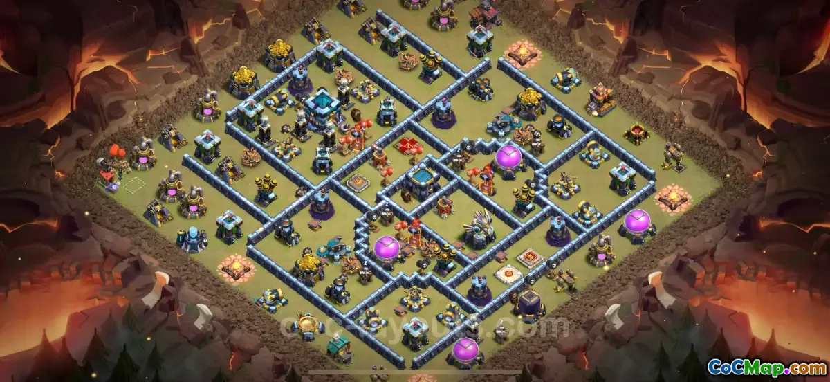 Kluczowe cechy tej bazy TH13 obejmują scentralizowany ratusz, który często jest chroniony przez obronę zadającą duże obrażenia i wzmocniony murami. Takie ustawienie utrudnia atakującym łatwe zniszczenie ratusza bez narażania się na znaczny ogień ze strony struktur obronnych. Dodatkowo strategicznie rozmieszczone zabezpieczenia przed obrażeniami rozpryskowymi, takie jak Wieże Czarodziejów i Wieże Bombowe, są rozmieszczone tak, aby atakować skupione oddziały i zapewniać pokrycie całej bazy.
