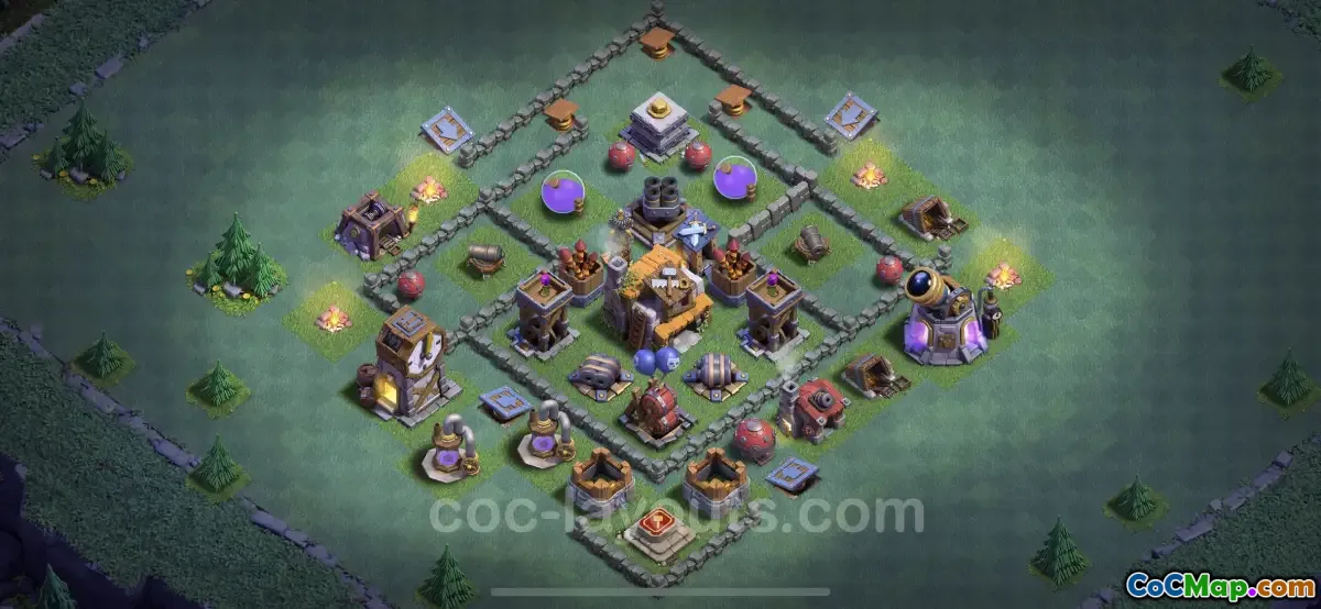 The Builder Hall Level 5 Anti 3 Stars Base in Clash of Clans is designed specifically to prevent opponents from achieving three-star victories. This base layout features strategic placement of defenses and structures to create a formidable challenge for attackers. The design emphasizes protecting the Builder's Hall while ensuring that enemy troops struggle to reach and destroy key components of the base. The inclusion of traps and obstacles further enhances its defensive capabilities, making it a preferred choice for players seeking to safeguard their resources and trophies.