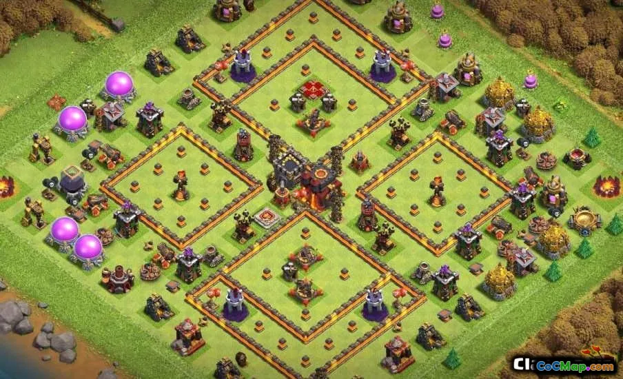 Gra Clash of Clans zawiera różne układy podstawowe, które gracze mogą wykorzystać do poprawy swojej gry. W szczególności w ratuszu 10 gracze mają dostęp do kilku strategii budowania rodzinnej wioski, bazy wojennej i bazy trofeów. Każdy układ ma inny cel, optymalizując obronę i zarządzanie zasobami, zapewniając jednocześnie skuteczną strukturę atakowania i obrony przed innymi graczami.