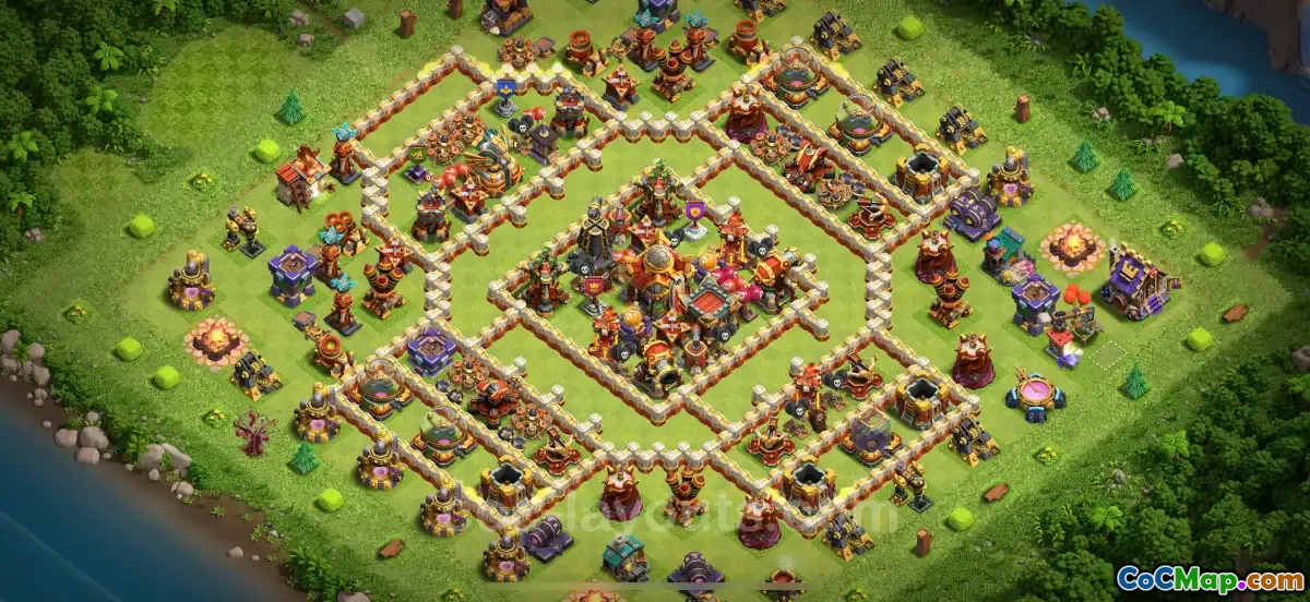 This Town Hall 16 (TH16) Trophy Defense Base designed for Legend League players offers a robust layout aimed at safeguarding trophies and preventing attackers from achieving high star victories. The strategic placement of splash damage defenses, traps, and walls creates a resilient barrier against common attack strategies, making it difficult for enemies to reach the core and secure significant trophies.
