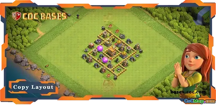 The layout features centralized defenses and a reinforced perimeter, ensuring attackers face multiple layers of resistance. It also includes strategic placement of air defenses and bombs to counter air and ground assaults effectively. This base is ideal for players looking to improve their defense capability at Town Hall level 5, providing a strong barrier against some of the most common attack strategies. Use the provided link to easily set up this effective, anti-3 star hybrid layout in your Clash of Clans village.