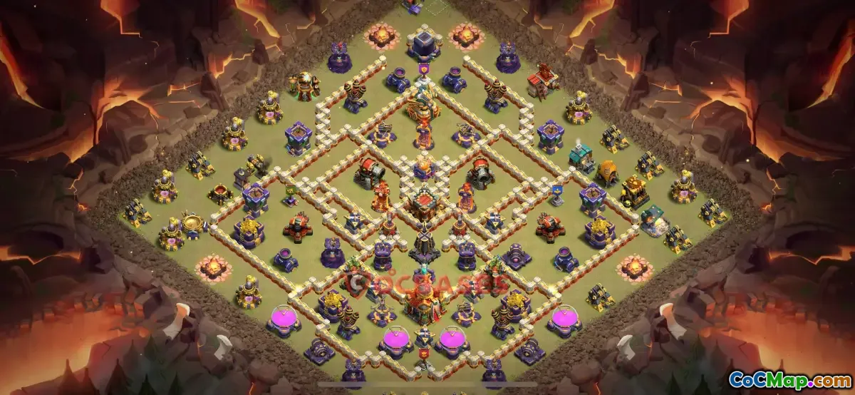 This Town Hall 16 hybrid base design for Clash of Clans is specially crafted to provide a balanced defense setup that effectively protects your resources and Town Hall. Hybrid bases are designed to defend against both attack types—those targeting resources and those aiming to take out the Town Hall—making them ideal for players looking to safeguard their loot and trophies simultaneously.