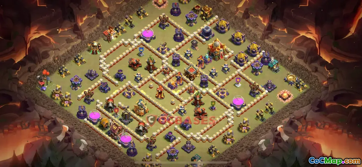 This hybrid layout often incorporates strategic placement of key defenses like Inferno Towers, Eagle Artillery, and X-Bows to cover critical areas of the base. Resource storage units are usually shielded within the core or behind multiple layers of defenses, preventing easy looting. It also features cleverly positioned Clan Castle and Heroes' defenses to have a protective zone that activates quickly when under attack, providing the player with increased survivability during raids.