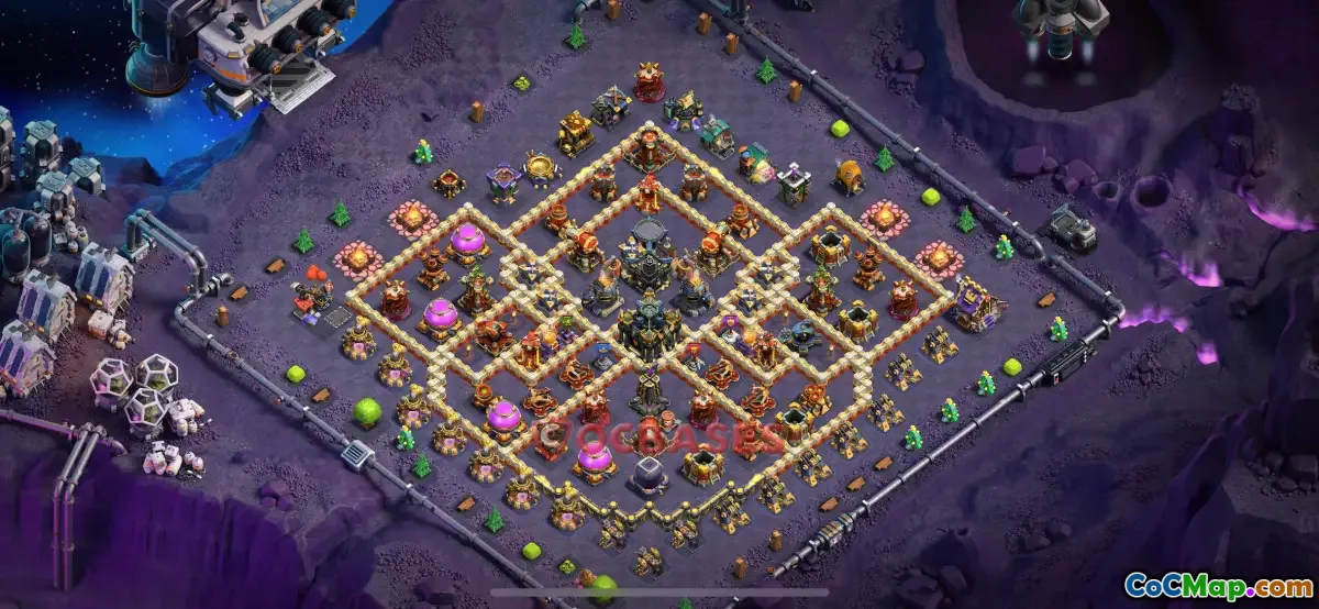 Having a well-constructed hybrid base at Town Hall 17 can significantly improve your chances of defending against both ground and air assaults. The layout often emphasizes centralized key structures, such as the Town Hall itself, Clan Castle, and main resource storages, to make them harder for enemies to reach and destroy. Additionally, strategic placement of walls, cannons, archer towers, and other defenses helps create multiple layers of protection, dissuading attackers from focusing on a single point.