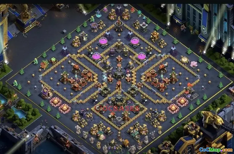 The Town Hall 17 war base in Clash of Clans is a strategic layout designed to defend against enemy attacks during clan wars. This base setup typically emphasizes protecting the core of the base, where the Town Hall and key resources are located, by placing walls and defensive structures in a manner that slows down enemy troops and minimizes damage. The design aims to create overlapping fields of fire for defensive buildings like cannons, Archer Towers, and Inferno Towers, making it difficult for attackers to penetrate the defenses quickly.