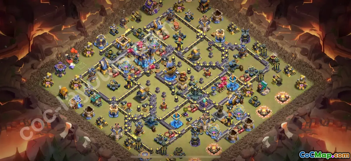 This TH18 war base design is strategically crafted to maximize defenses against two-star attacks in Clan Wars. Its well-placed traps, walls, and defensive buildings create a strong barrier that frustrates even skilled attackers. The layout's centralized Clan Castle and Scattershots provide comprehensive coverage, ensuring quick activation and minimal breach points, making it harder for opponents to secure two stars.