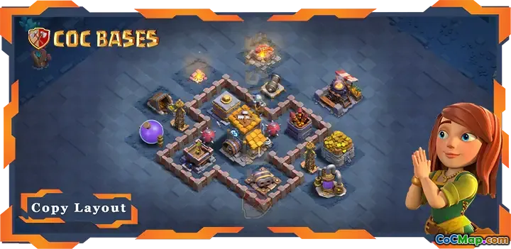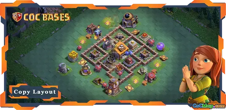 A base bh06 foi projetada com um layout estratégico que coloca o hall do construtor no centro da estrutura. Este posicionamento central é crucial porque permite uma melhor defesa, protegendo o salão do construtor de ataques recebidos. Ao redor do salão dos construtores estão estruturas defensivas importantes, incluindo um morteiro múltiplo e um triturador, que estão estrategicamente posicionados para maximizar sua eficácia contra as tropas inimigas.