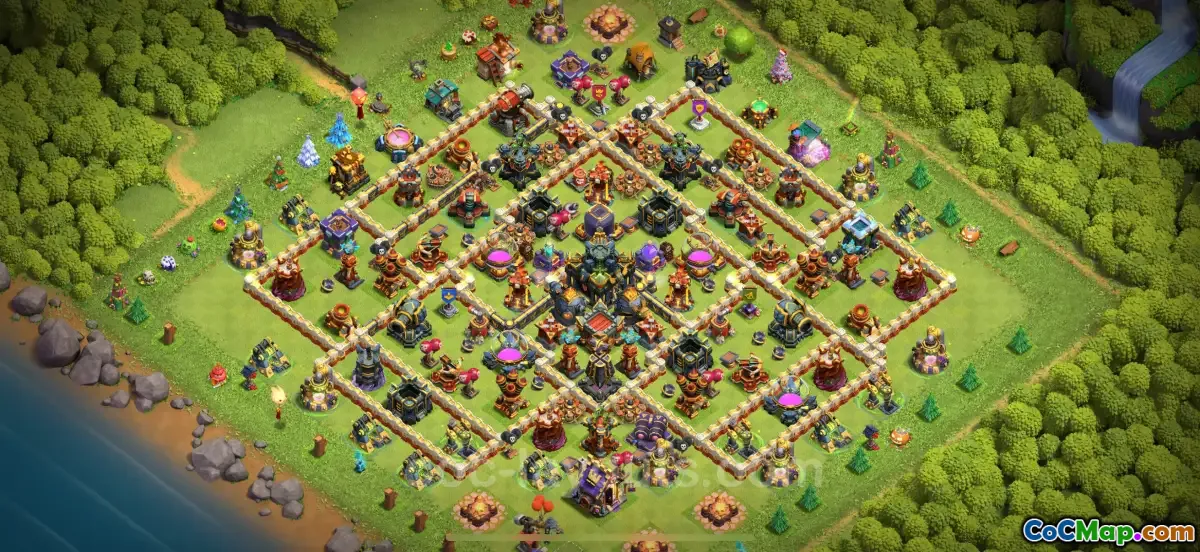 The design of a Farming Base for Town Hall Level 17 in Clash of Clans focuses on optimizing resource defense while simultaneously protecting against full-star attacks. The 2025 layout features a hybrid approach that strategically positions defenses to deter attackers from achieving three-star victories. This base design incorporates a well-thought-out arrangement of buildings, traps, and defensive structures to create a formidable barrier for adversaries.