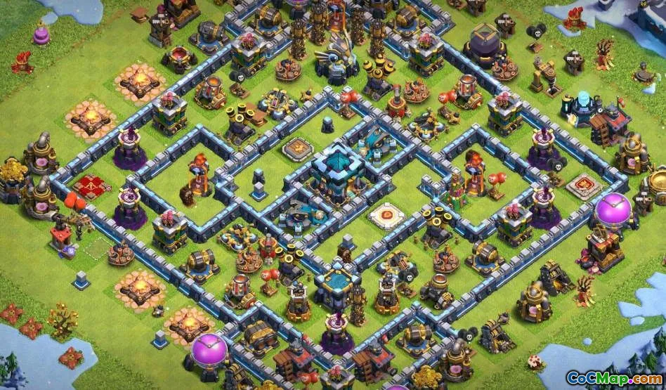 O layout da prefeitura 13 normalmente inclui um arranjo equilibrado de estruturas, armadilhas e armazenamentos de recursos defensivos para suportar ataques de oponentes. Os jogadores geralmente procuram designs específicos que possam ajudá-los a manter seus troféus e proteger seus itens suados. Uma base de troféus bem elaborada será frequentemente compacta, com a prefeitura localizada centralmente, cercada por outros edifícios e defesas importantes para impedir os atacantes. Por outro lado, as bases de guerra são projetadas especificamente para ligas de guerra do clã ou guerras regulares do clã, concentrando-se fortemente em impedir que o inimigo consiga uma vitória de três estrelas.