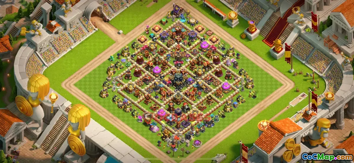 Um layout de base híbrida do Centro de Vila 17 no Clash of Clans foi projetado para defesa eficaz contra diversas estratégias de ataque, com foco especial em cavaleiros-raiz, Valquírias e dragões. À medida que o jogo evolui, os jogadores procuram constantemente designs básicos que possam resistir às ameaças mais recentes introduzidas nas atualizações. Este layout específico ganhou reconhecimento por sua capacidade comprovada de mitigar os danos causados por essas tropas populares.