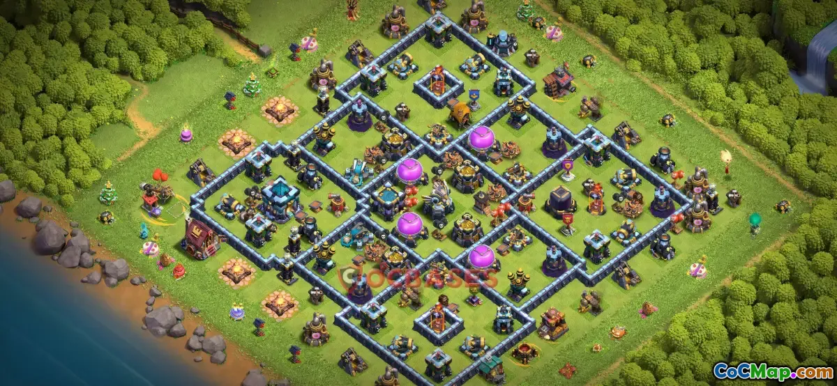 The Town Hall 13 farming base is designed specifically for maximizing resource protection and efficient raiding in Clash of Clans. This base layout typically features well-thought-out walls, strategic positioning of resource storages, and traps to deter attackers from easily accessing valuable resources such as gold, elixir, and dark elixir. The goal is to create a sturdy defense that forces opponents to spend more time and effort, reducing the likelihood of losing resources during raids.