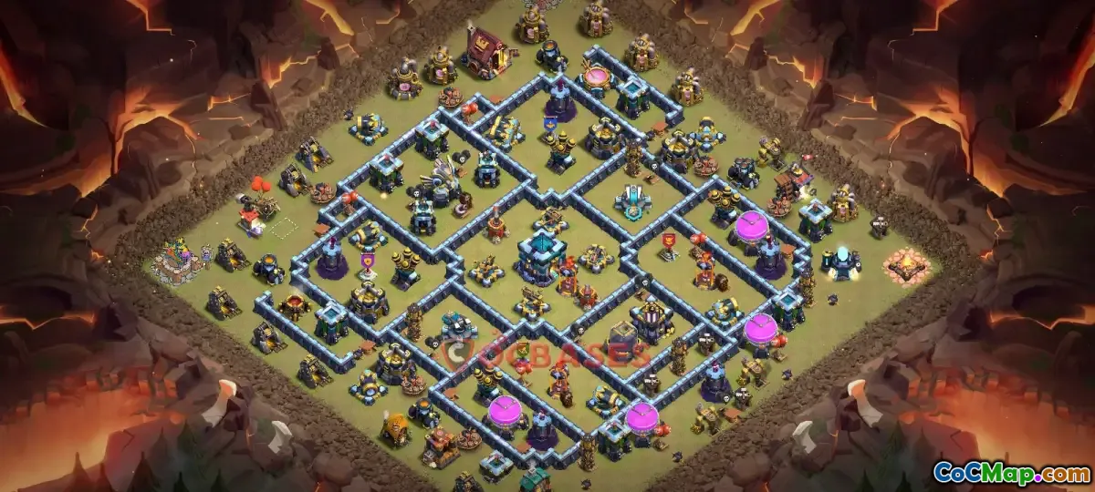 This Town Hall 13 war base layout offers exceptional defense against opponents aiming for a 3-star victory. It features layered walls, well-placed traps, and strategic placement of defensive structures to slow down critical attacking troops.