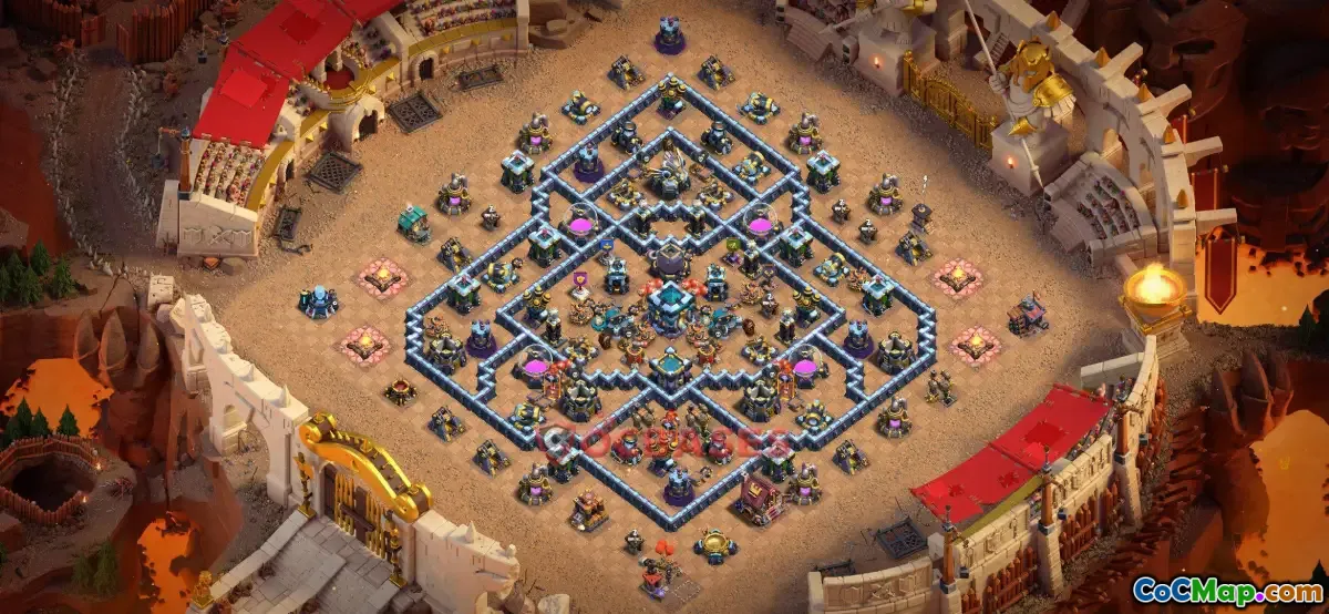The Town Hall 13 war base in Clash of Clans is designed to offer strong defenses and protect the player's resources during clan wars. This level introduces new defense structures and updates that require strategic placement to effectively thwart enemy attacks. Players often focus on creating a balanced layout that distributes defenses such as Inferno Towers, X-Bows, and Archer Towers to cover all angles, while also safeguarding key buildings like the heroes’ altars and Clan Castle.