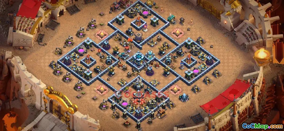 The Town Hall 13 war base design in Clash of Clans is a strategic layout crafted to defend against opponent attacks during clan wars. It focuses on protecting the core of the base, including the Town Hall, Clan Castle, and key resource storages, while also placing walls and defenses in a way that slows down and redirects enemy troops. This setup aims to provide a balance between protecting vital structures and creating effective traps to surprise attacking troops, ultimately increasing the chances of winning wars.