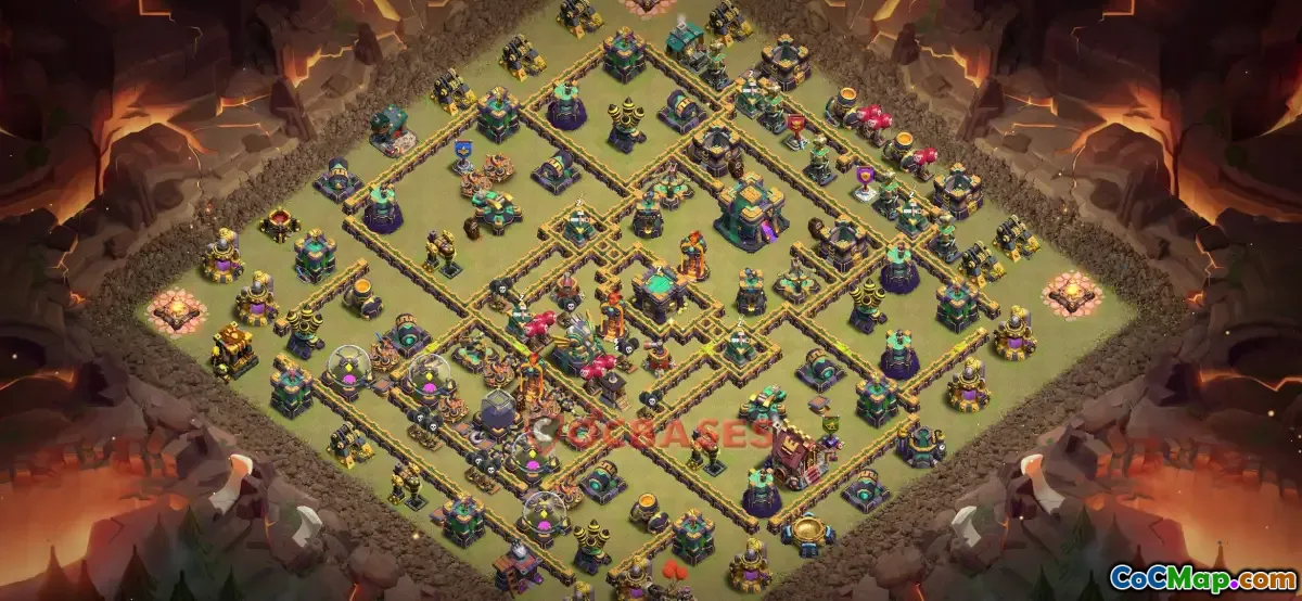 The Town Hall 14 war base in Clash of Clans is designed primarily for strategic defense during clan wars. It typically features well-laid out defensive structures such as spells, traps, and walls to protect the core of the base. The goal is to make it difficult for opponents to reach and disrupt the Town Hall, which is a primary target for attackers to earn stars and victory points.