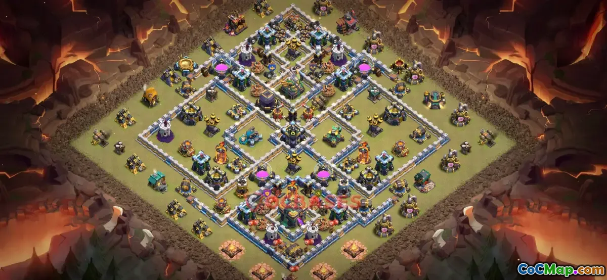 The Town Hall 14 war base in Clash of Clans is a strategically designed layout optimized for defending against enemy attacks during clan wars. It typically features well-placed defenses, such as multi-target archer towers, cannons, wizard towers, and new defenses introduced at this level, like the Giga Inferno. The placement of heroes, walls, and traps is crucial to prevent attackers from successfully breaching the core of the base and to protect the Town Hall, which is a primary target for opponents aiming to maximize destruction and stars.