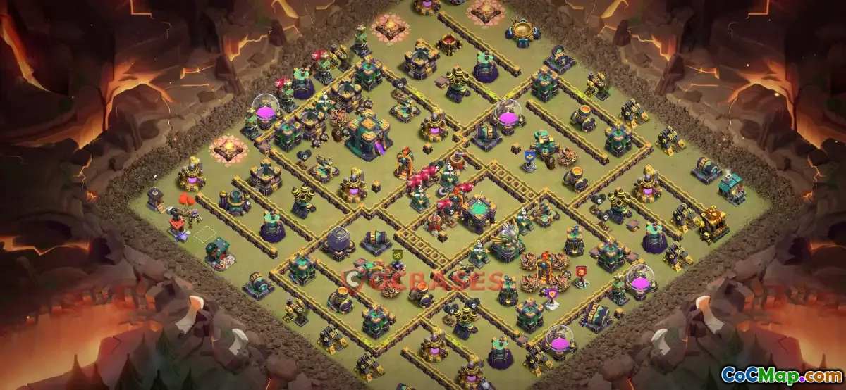 The Town Hall 14 war base in Clash of Clans is designed to provide strong defense mechanisms to protect resources and defend against enemy attacks during clan wars. This layout typically emphasizes a balanced distribution of defensive structures, such as Archer Towers, Cannons, and Wizard Towers, to cover all possible attack routes. Proper placement of the Clan Castle, Air Defenses, and Heroes like the Archer Queen and Barbarian King is crucial in creating an effective war base that can withstand various attack strategies.