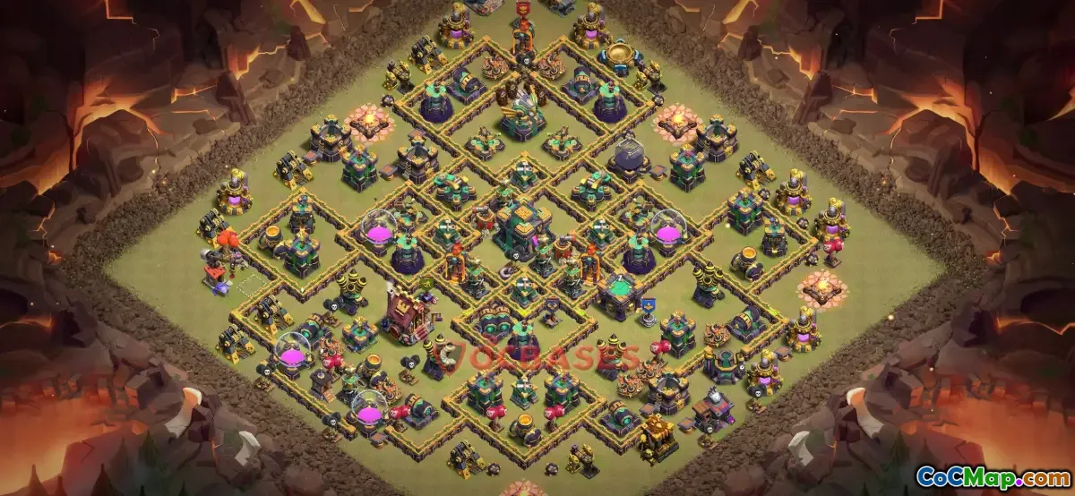 The Town Hall 14 war base in Clash of Clans is designed to offer a strong defense against opponents during clan wars. It incorporates various fortified structures, traps, and strategic placement of defensive units to protect the core resources and town hall from enemy attacks. This level of base layout aims to prevent enemies from achieving a high percentage of destruction and winning the war easily.