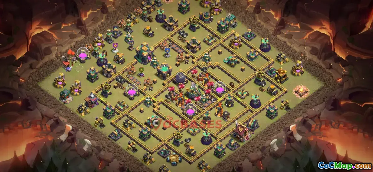 The Town Hall 14 war base in Clash of Clans is designed to provide strategic defenses against opponents during clan wars. This base layout typically features well-placed walls, traps, and defensive structures such as Archer Towers, Cannons, and Wizard Towers to protect the Town Hall and resources. The main goal of this design is to prevent enemy troops from easily reaching and destroying the Town Hall, which is crucial for winning wars and earning stars.