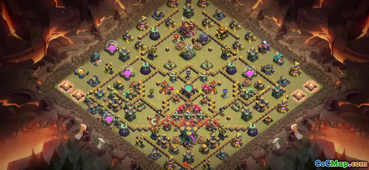 The Town Hall 14 war base layout in Clash of Clans is designed to provide robust defense against attacking armies. It features a strategic arrangement of defensive structures, such as cannons, archer towers, and air defenses, meticulously positioned to cover key areas of the base. This setup aims to delay and weaken enemy attacks, making it more difficult for opponents to achieve a three-star victory.