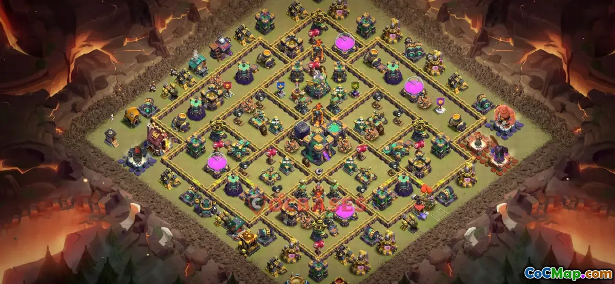 The Town Hall 14 war base in Clash of Clans is a strategic design used by players to defend their resources and trophies during clan wars. This base layout is specifically created to thwart attacking strategies by enemies, making it difficult for opponents to secure stars or loot resources. The design often includes well-placed walls, traps, and defenses like Archer Towers, Cannons, and the new Hero Altar for the Grand Warden, all arranged to protect critical structures and prevent easy access to the Town Hall.
