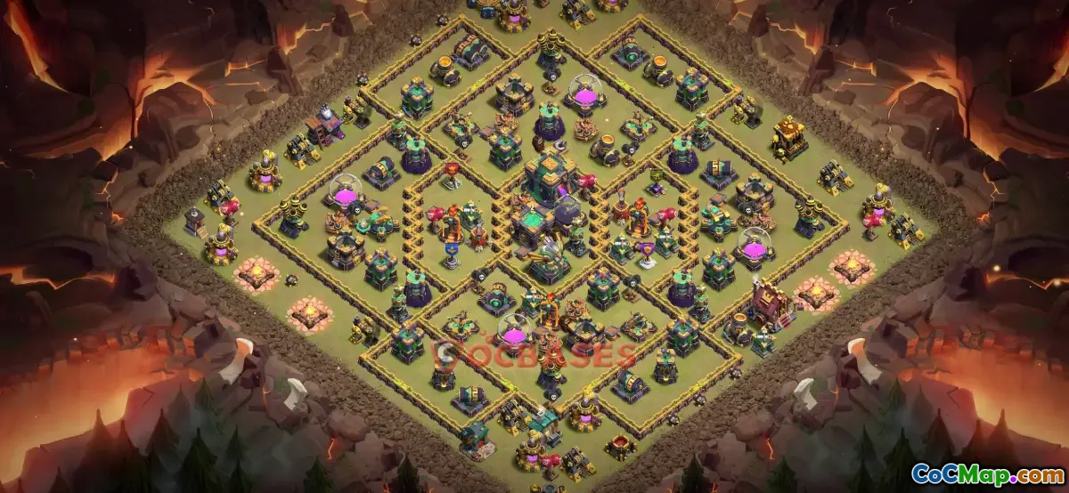 The Town Hall 14 war base design in Clash of Clans is a strategic layout aimed at defending against enemy attacks during clan wars. It incorporates various defensive structures such as cannons, archer towers, and splash damage units strategically positioned to protect key resources and the Town Hall itself. The layout often emphasizes a balanced distribution of defenses to prevent attackers from easily breaching the core, with walls arranged to create multiple compartments, slowing down enemy troops and funneling them into kill zones.