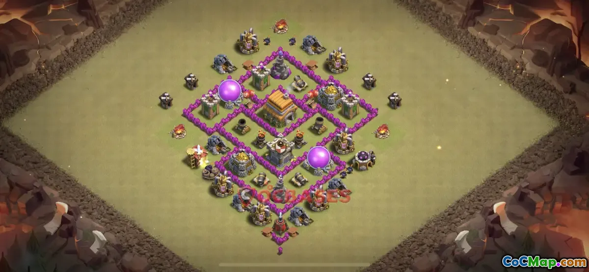 This Town Hall 6 hybrid base layout is designed to provide strong defense against both attacks from attacking troops and farming raids. Its versatile design offers a balanced distribution of resources and defenses, ensuring sustainability and resilience.